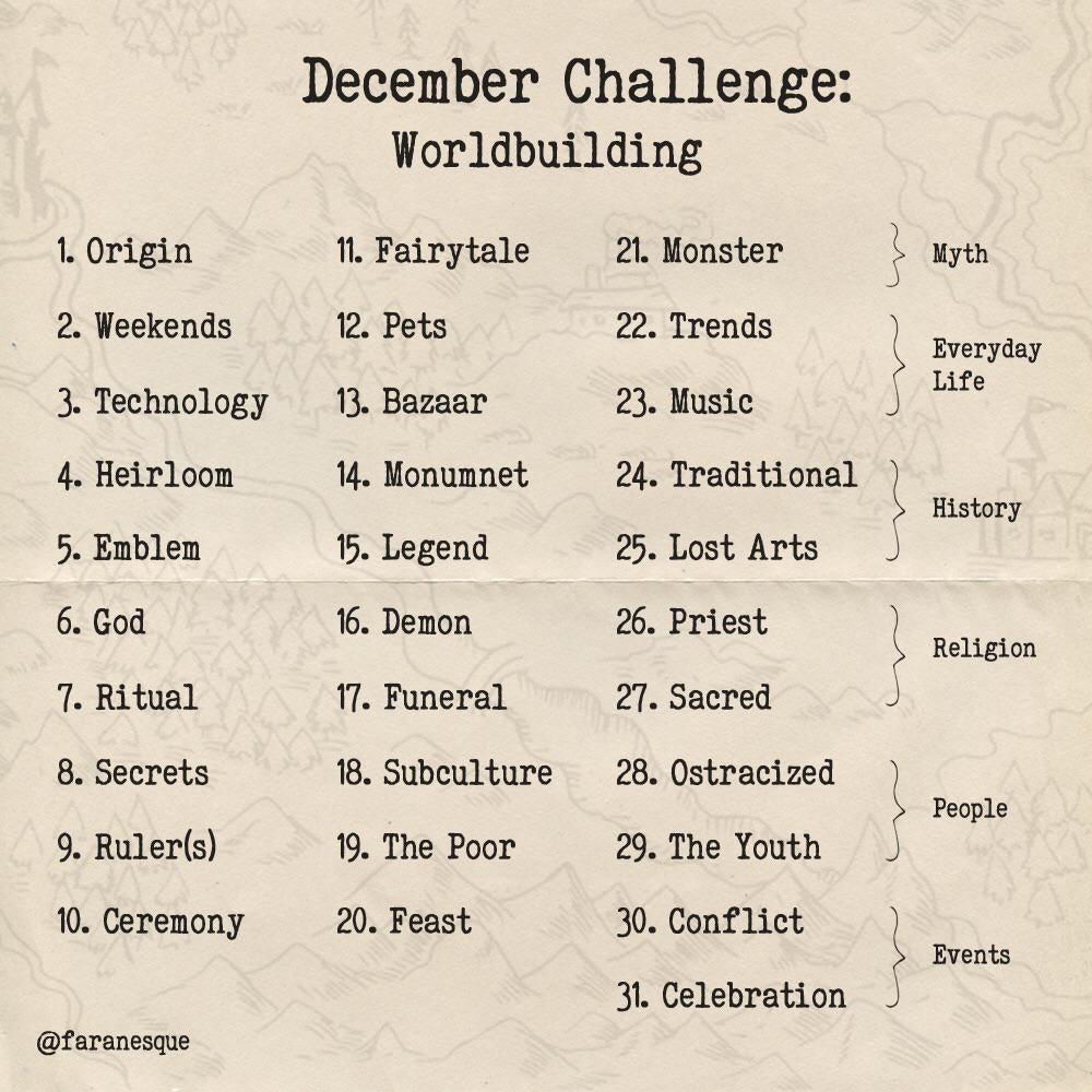 So instead, I’m going to go through the December Worldbuilding Challenge I found, and write some stuff for it.
